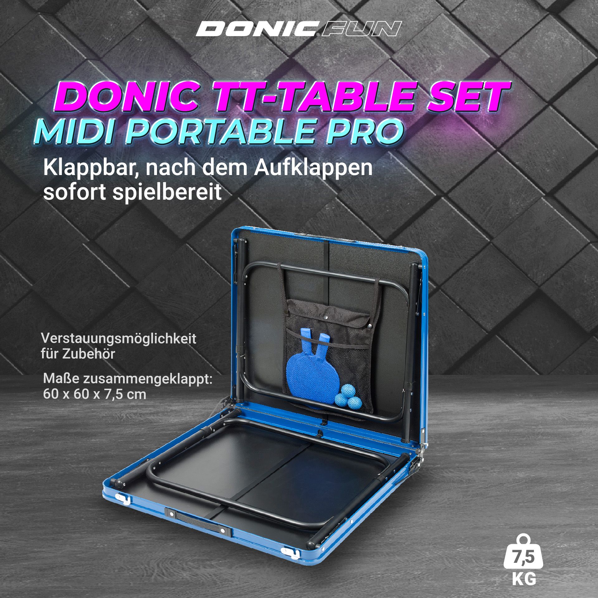 Die faltbare DONIC Tischtennisplatte MIDI-Portable PRO ist ideal für alle begeisterten Tischtennisfans, die nicht die nötigen Platzverhältnisse im Garten oder im Haus haben und zudem an unterschiedlichen Orten spielen möchten. In Sekundenschnelle aufgestellt, überzeugt der komplett vormontierte Fun-Spieltisch neben der Funktionalität vor allem durch seine vielfältigen Einsatzmöglichkeiten und eine umfangreiche Sonderausstattung.
